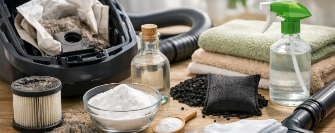 Bicarbonato de sódio: Polvilhe uma pequena quantidade no chão e aspire. A soda é um excelente adsorvente e neutraliza os odores ácidos.